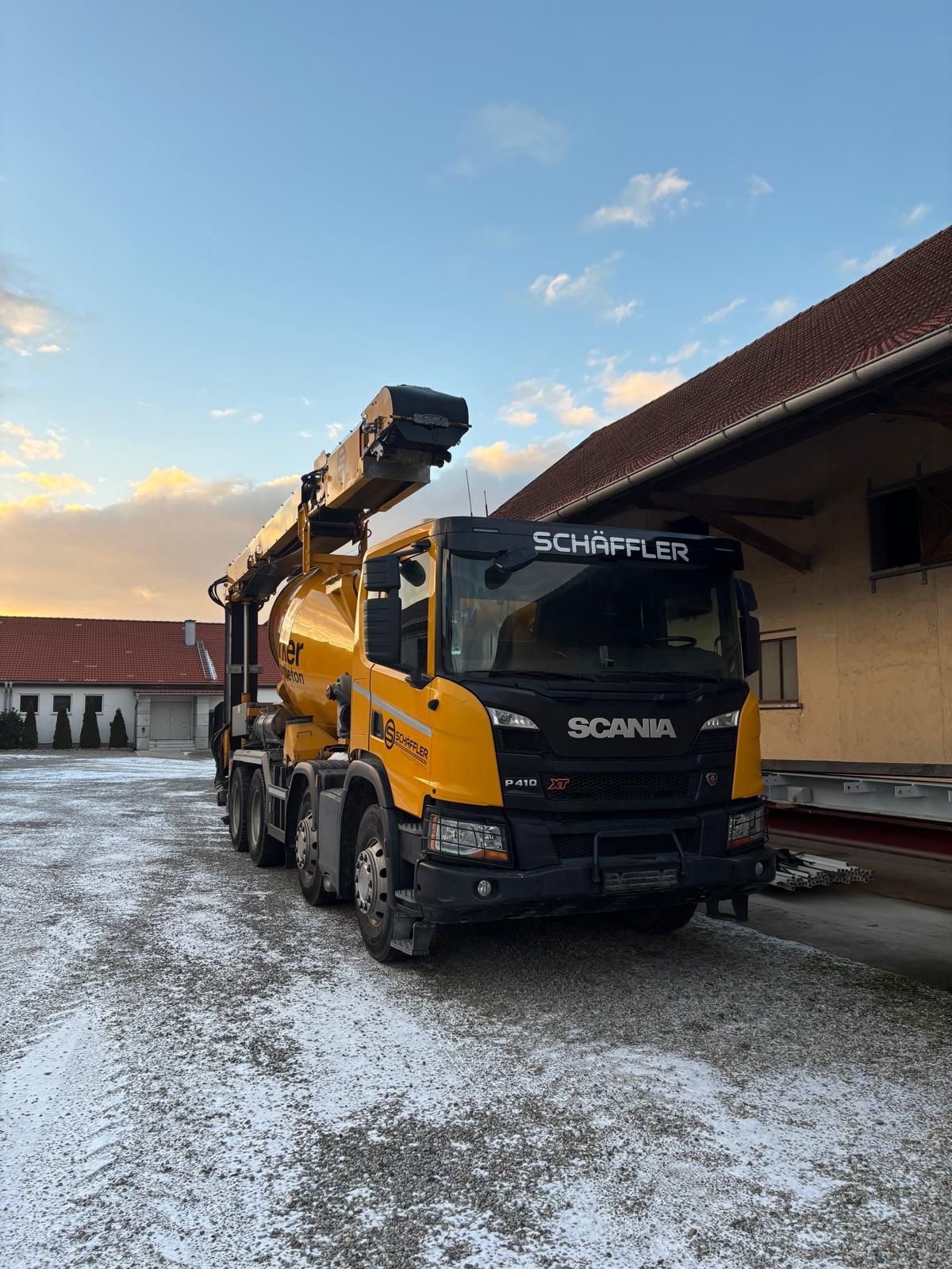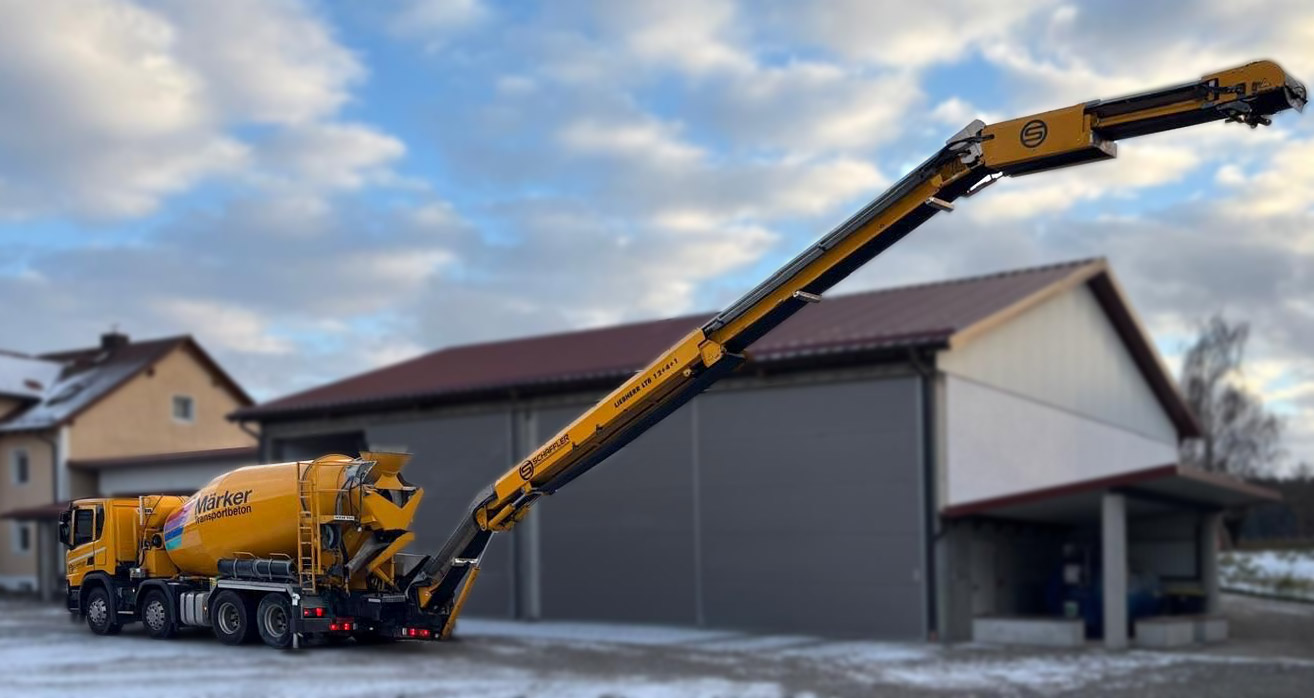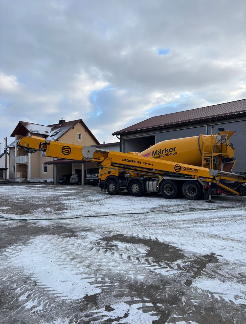 Warum kompliziert, wenn es effizient geht? Mit unseren modernen Betonmischern inklusive integriertem Teleskop-Förderband liefern wir Baustoffe direkt an den Einbauort – schnell, sauber und wirtschaftlich.